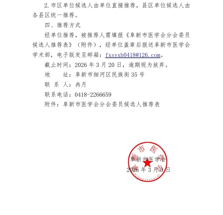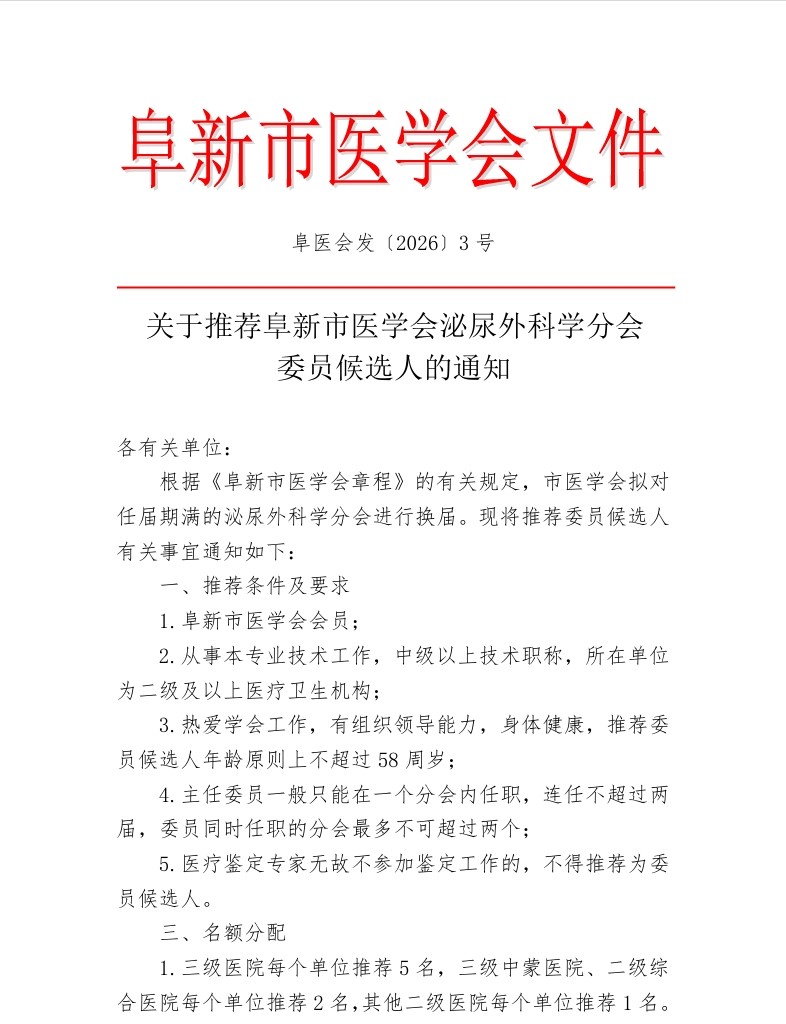 关于推荐阜新市医学会泌尿外科学分会委员候选人的通知 阜医会发〔2026〕3号